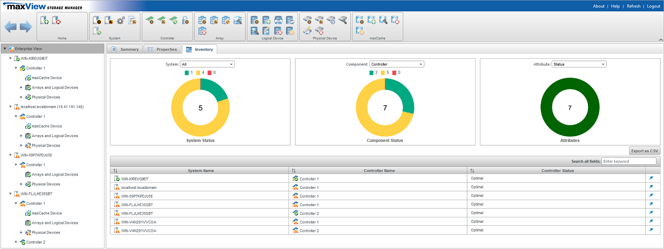 - System chart that displays the tree node status of the system(s). The drop-down menu of the system chart provides the option to view system or all the system currently being managed using maxView.