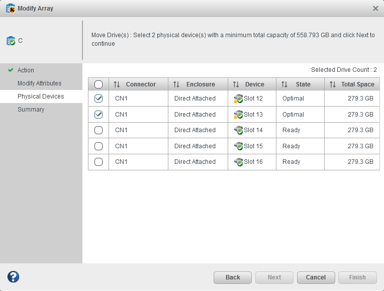 Note: The drives must have sufficient capacity to hold all of the logical drives in the source array.Note: For details on SED support operations while modifying an array, see Modify Array. - Click Next, review the summary information, then click Finish.