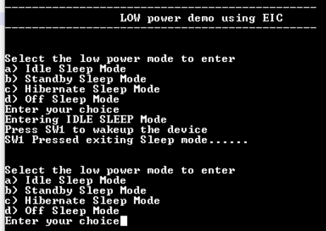 This application demonstrates entering the low power modes and exiting it using the EIC.