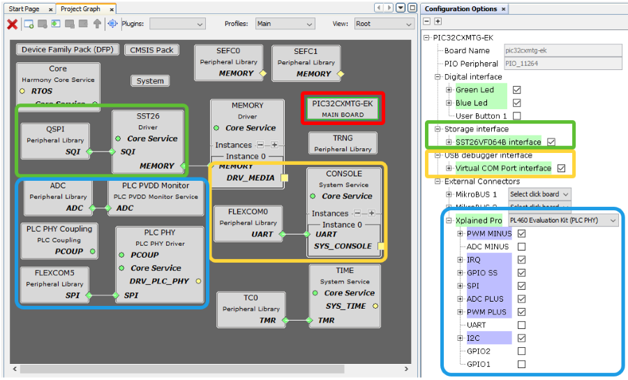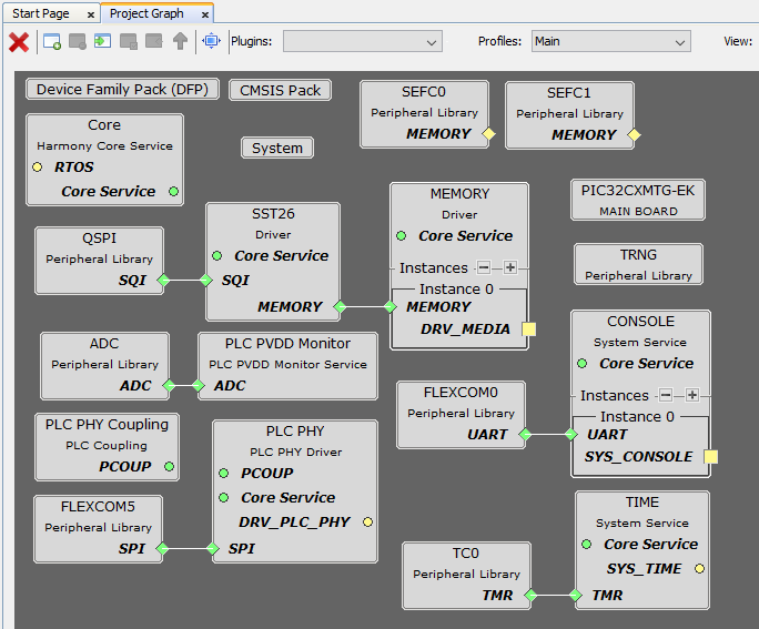 The following figure shows the MCC project graph of PHY Tx Test Console application for PIC32CXMTG-EK: