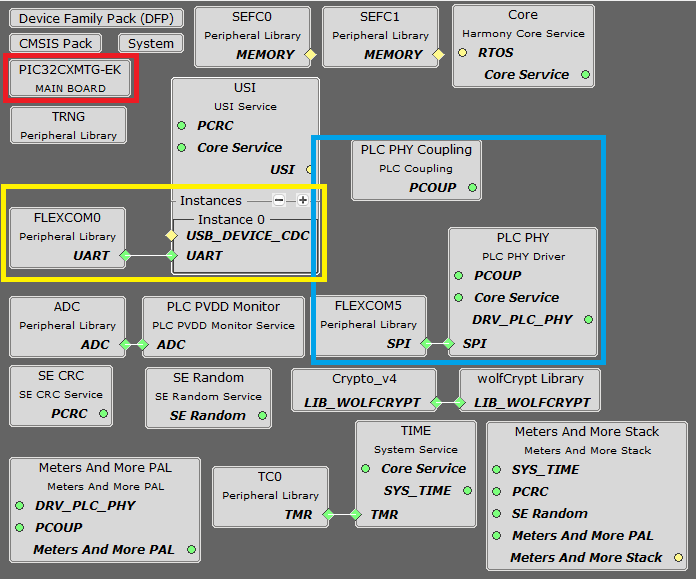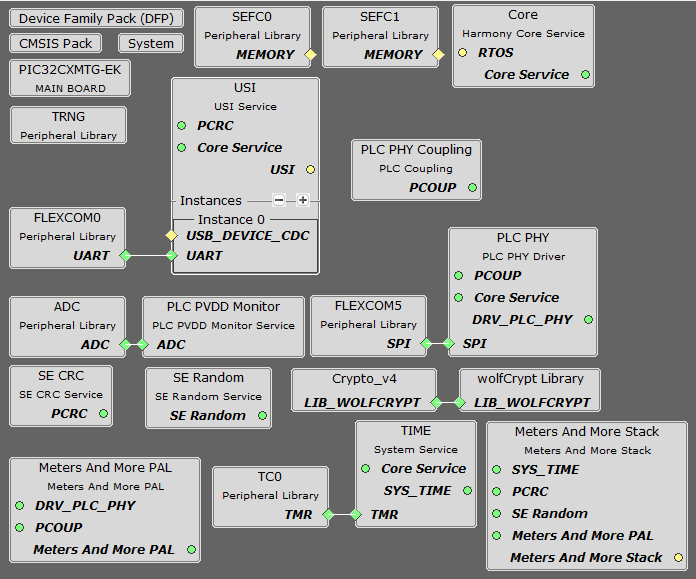 The following figure shows the MCC project graph of USI Modem App for PIC32CXMTG-EK: