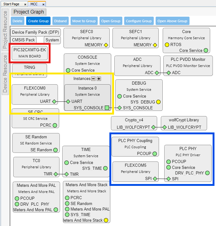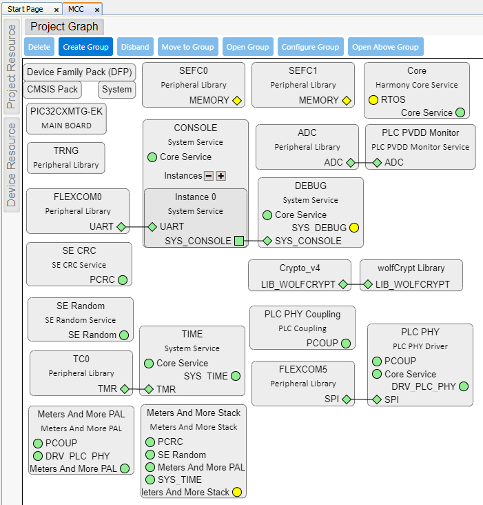The following figure shows the MCC project graph of DCU App for PIC32CXMTG-EK.