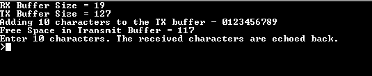 - The message asks the user to enter 10 charactersNote: For this example, the “Free Space in Transmit Buffer = xx”, where xx can be anything between 117 to 127, depending on the USART baud rate and the CPU execution speed.