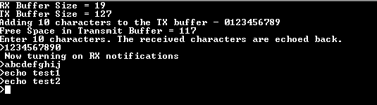 - It then adds 10 characters - “0123456789” to the transmit buffer and displays the available free space in the transmit buffer after the 10 characters have been added