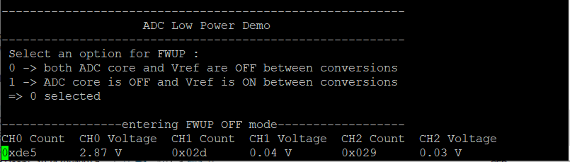 - Observe ADC entering sleep mode with Fast Wake up OFF. Console displays