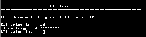This example application shows how to configure alarm interrupt using the RTT Peripheral Library. The application sets up an alarm to be generated after 10 seconds. The application displays a message on the alarm trigger.
