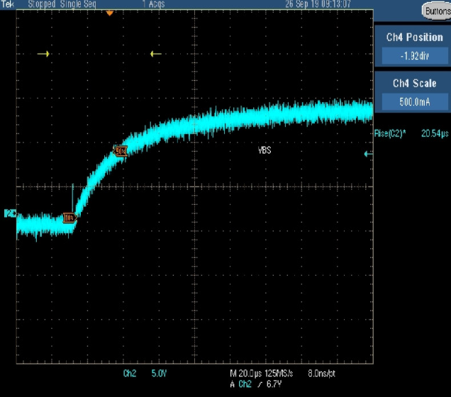 Typically, values for RBx are 3Ω to 10Ω, enough to dampen the inrush current but have little effect on the VBS turn ON. Below are some scopeshots illustrating the effect of different RBx values.