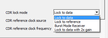 Lock to Data with 2X Gain: This transceiver option implements the fast clock-data recovery when incoming data streams such as stressful SDI patterns require high gain to quickly phase lock to the incoming pattern. This mode produces faster lock times than that of normal Lock to data mode.