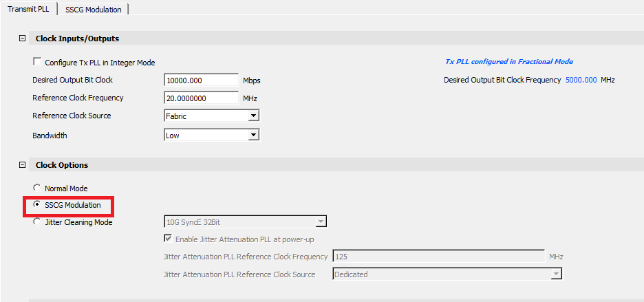 Table 2-3. Transmit PLL Configurator GUI Options Clock Inputs Options Default Details Configure Tx PLL in Integer Mode Enable and disable Disabled When disabled, it is in TXPLL Fractional N Mode. When enabled, it allows fixed value of available reference clock frequencies. Reference Clock Source Dedicated and fabric Dedicated Dialogue box requires input clock rate (200 MHz default) Desired Output Bit Clock VCO rate, and output clock (MHz) 10000 Mbps, 5000 MHz Only valid combinations can be entered based on reference clock and PLL capability. This value represents the BIT_CLK output speed. Bandwidth Low/High Low By default, the Tx PLL selects the low bandwidth option in order to filter more of the reference clock jitter. If the system has a low-jitter reference clock, the user can then set it to high bandwidth mode to decrease the overall jitter. Low bandwidth has longer lock times than high bandwidth. Clock options (Only one option can be selected) Normal Mode Enable and disable Enabled Radio-button on = enabled SSCG Modulation Enable and disable Enabled Radio-button on = disabled Jitter Cleaning Mode Enable and disable Disabled Radio-button on = disabled The following options are available when enabled: 10G SyncE 32Bit