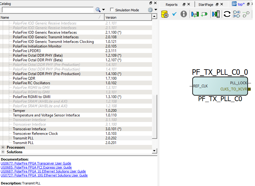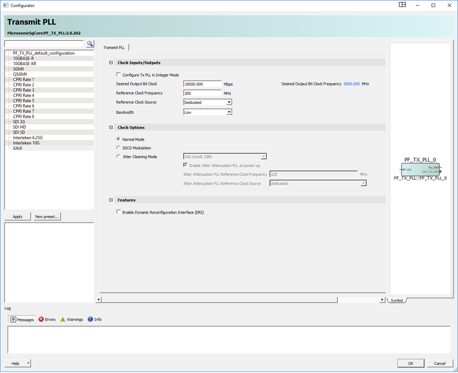 - Double-click each PF_TX_PLL block from the catalog to launch the configurator. A GUI allows the option of selecting the related transmit PLL properties.