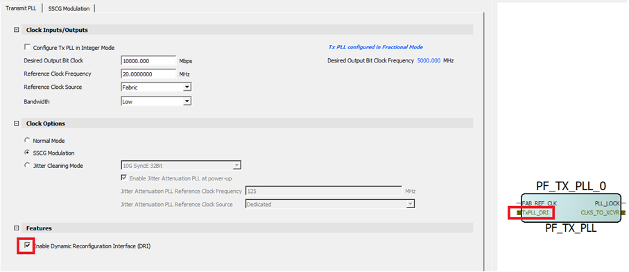 - Click Enable Dynamic Reconfiguration Interface (DRI) checkbox to add the ports needed to connect the Transmit PLL to the DRI. See PolarFire Family Device Power-Up and Resets User Guide for more information about DRI usage and specifications.