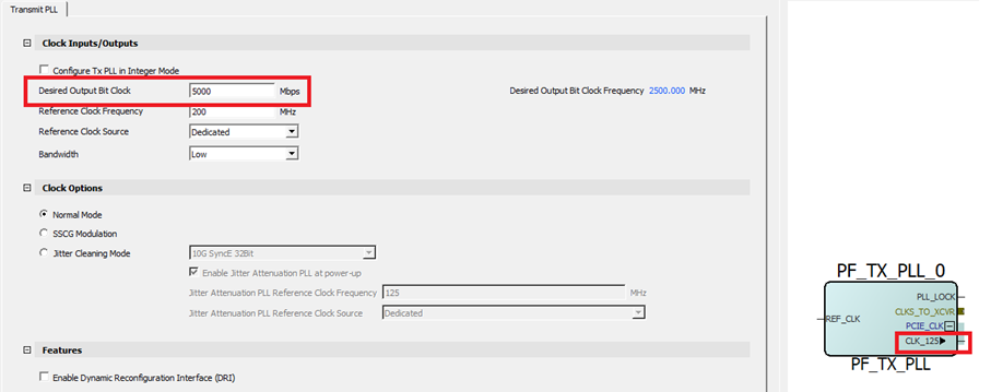 The TxPLL supports an additional clock output. This CLK_125 output port is automatically exposed when TxPLL BIT_CLK is 5 Gbps. This clock is used with the PCIE macro as input to the transaction layer or AXI clock. For more information about CLK_125, see PolarFire Family PCI Express User Guide.
