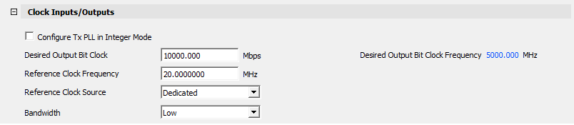 - Enter the values in Desired Output Bit Clock. Frequency cannot be entered—it is calculated automatically based on the speed (data rate in Mbps) and the reference clock.