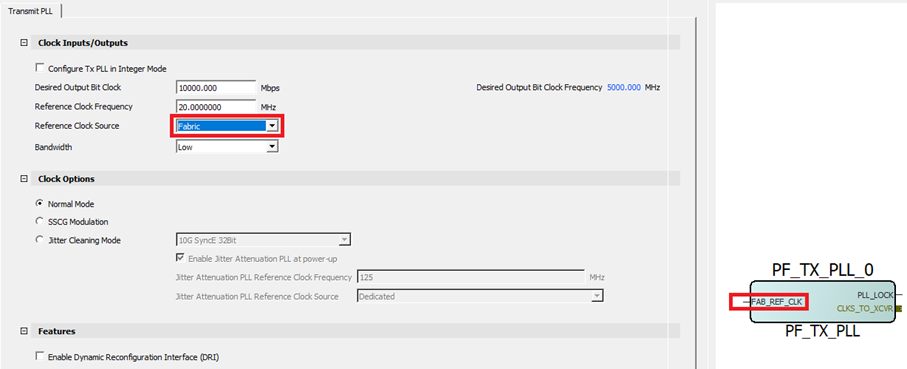Features Enable Dynamic Reconfiguration Interface (DRI) Enable and disable Disabled Adds Pins to TXPLL component for using Dynamic Reconfiguration Interface. See PolarFire Family Device Power-Up and Resets User Guide for DRI information. Note: For information about pin functions, see Table 1-18. - Select one of the Reference Clock sources (dedicated source is the default) to define Clock Inputs and enter the reference clock value.