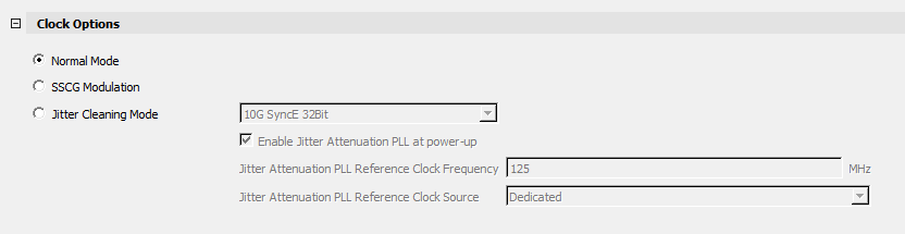 Normal Mode configures the TX PLL to default operation based on the clock Inputs/Outputs setting. Whereas, Jitter Cleaning mode customizes the attenuation coefficients for the pre-defined standards to be used where the recovered clock can be used as a TX reference clock to meet protocol jitter specifications.