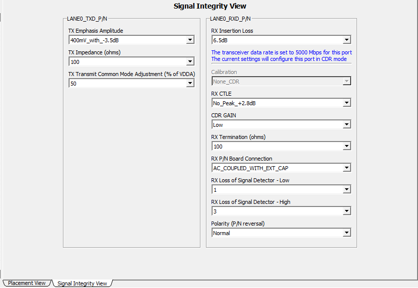 The following figure shows the XCVR Signal Integrity View tab. When user selects lane in Left Panel, the user can view and change the signal integrity parameters for the Rx and Tx transceiver ports.