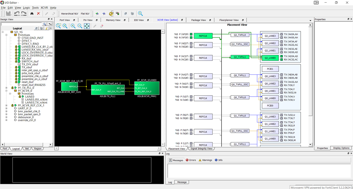 Placement View tab—Presents a physical view of the transceiver connectivity, including transceiver lanes (XCVR), Reference Clock (REFCLK), and Transmit PLLs (TxPLL).