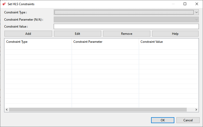 You can add, edit, or remove constraints from this window. Select a constraint type from the first drop-down menu. If you want more information about a constraint, click the Help button, which will open the corresponding Constraints Manual page.