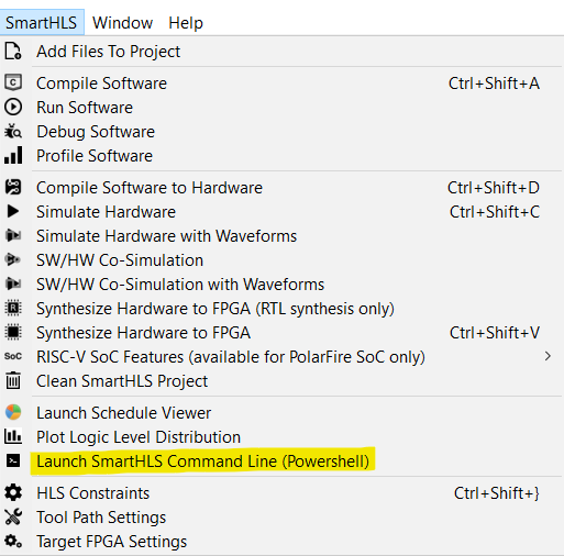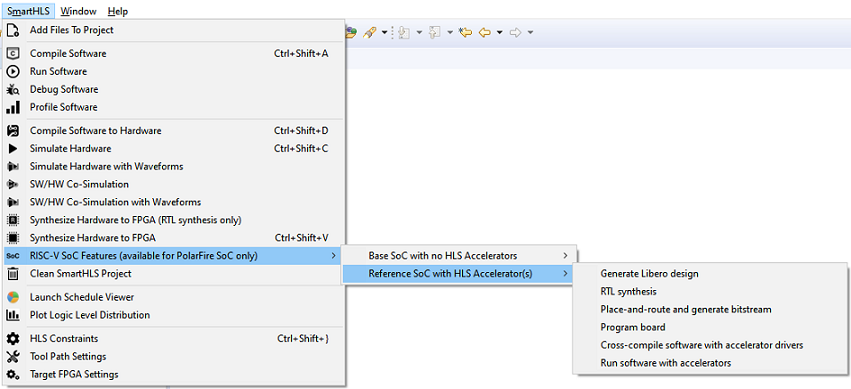 | soc_accel_proj_generate | Generates a reference SoC LiberoLibero/SmartDesignSmartDesign project, containing an MSS connected to SmartHLS™-generated hardware accelerators. Please see SmartHLS Reference SoC for more information. |