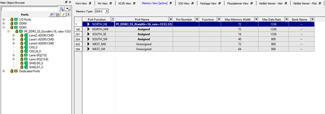 The Ports view also displays the memory width and data rate of the DDR instance in the design (if it exists in the design) in the top left row under the Port Name column, as shown in the following figure.