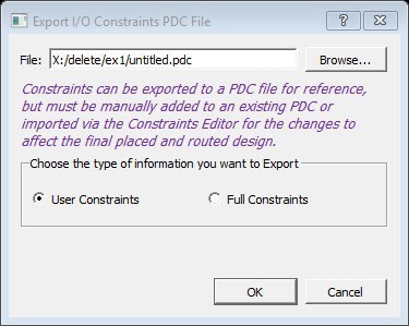 (Ask a Question)The I/O Editor allows you to export the physical constraints (I/O Constraints and Floorplan Constraints) of the design in a PDC file to any file location on your disk. You can export the User constraints or the Full constraints of the design. The I/O PDC files can be exported (File > Export Physical Constraint (PDC) > I/O Constraint), as shown in the following figure.