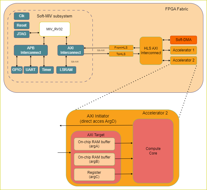One difference compared to the Icicle Kit Refernce Design is the DMA. For the Icicle Kit Reference Design, SmartHLS uses the hardened DMA part of the MSS, but the MiV_RV Reference DesignSmartHLS uses a Soft-DMA implemented on the FPGA fabric . When a C++ function argument is marked as AXI target with the DMA option set to true (e.g. #pragma HLS interface argument(<argname>) type(axi_target) dma(true)) SmartHLS will automatically instantiate the soft-DMA engine, connect it to the HLS AXI interconnect and generate the driver DMA API for the CPU to use it. If the DMA option is later disabled (dma(flase)) then the Soft-DMA engine will be automatically removed.