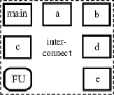 This prevents modules from being unnecessarily replicated, saving area. The hardware system may also use a functional unit (denoted as FU in the figure), such as a floating-point unit, which is also created at the same level. This architecture also allows such units, which typically consume a lot of area, to be shared between different modules.
