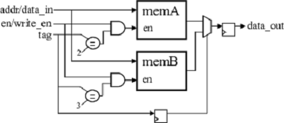 For clarity, some of the signals are combined together in the figure. Even though the figure depicts a single-ported memory, all memories are dual-ported by default, unless only a single memory access is needed per cycle, in which case it will be single-ported memory. The memory controller steers memory accesses to the correct RAM, by using a tag, which is assigned to each aliased memory by SmartHLS™. At runtime, the tag is used to determine which memory block to enable, with all other memory blocks disabled. The same tag is used to select the correct output data between all memory blocks.