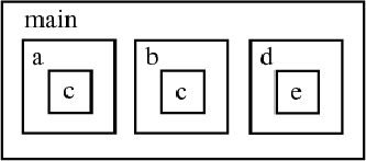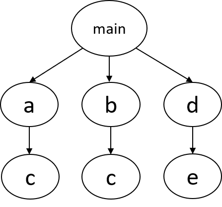 main calls a, b, and d, each of which calls c, c, and e, respectively. Notice that function c is called by both a and b. One way to create this system in hardware is to instantiate one module within another module, in a nested hierarchy, following how the functions are called in software: