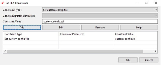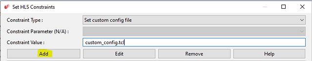 Set custom config filefrom the dropdown and enter the Constraint Value as "custom_config.tcl". - Click Add: