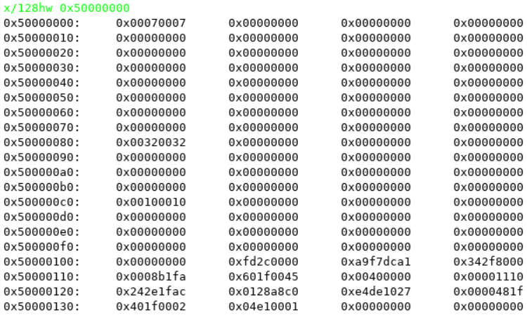 This response code can be forced to always zero by setting AXI_RRESP_ALWAYS_ZERO = 1 constraint, essentially ignoring any address decoding error. One reason to ignore this error is to perform memory monitoring or memory readout of the entire address space of a given HLS module for debugging purposes. This can be done in SoftConsole or with debuggers like gdb as can be seen in the following image using the command x/128hw 0x50000000, which means "read 128 words and print them in hex format starting at address 0x50000000", which would be the base address of the HLS module: