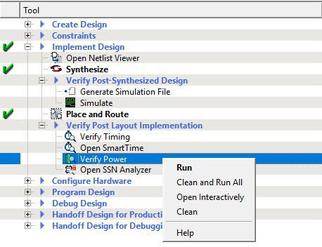 SmartPower generates detailed hierarchical reports of the power consumption of a design for easy evaluation. This allows you to find power consumption sources and take appropriate action to reduce power.