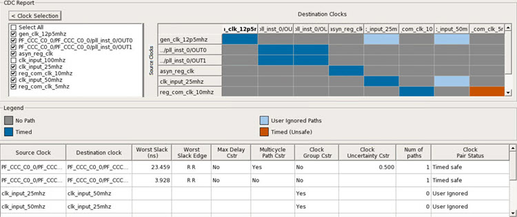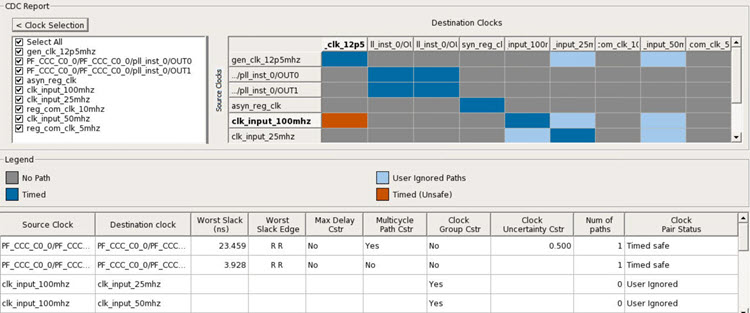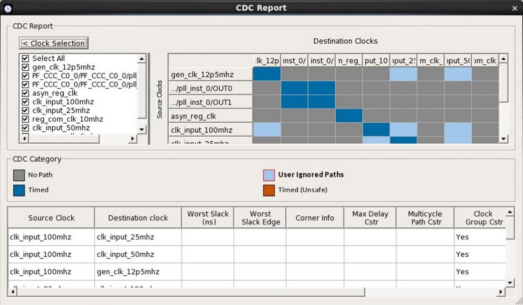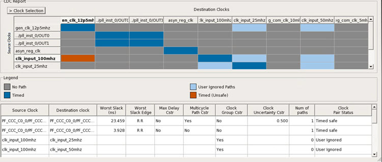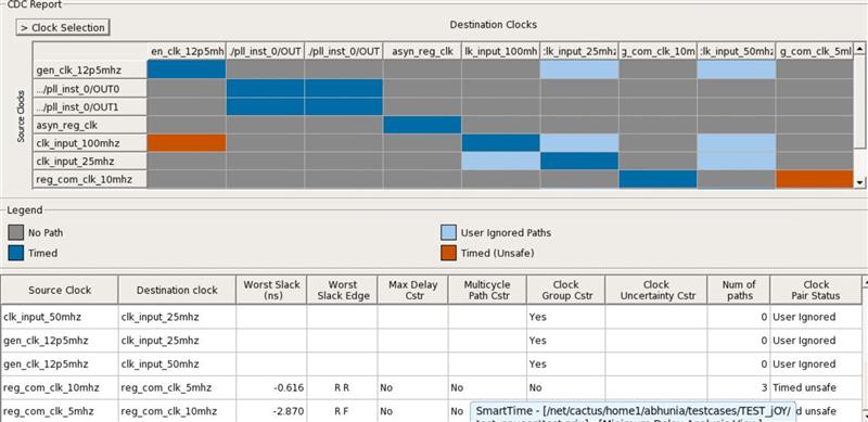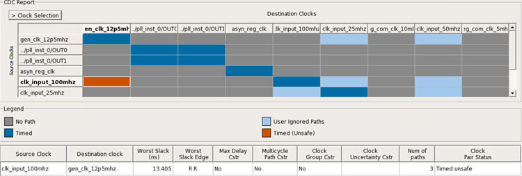 CDC table. Both the tables are in sync. Example: Here, clk_input_100mhz is selected,