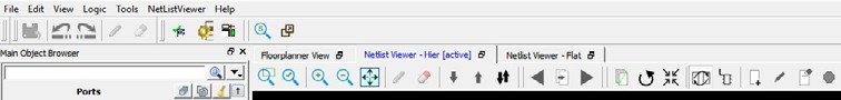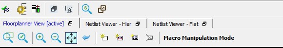 The Floorplanner View and the Netlist View feature different sets of icons specific to their views. There is also a Floorplanner View/Netlist Viewer menu that toggles between Floorplanner View and Netlist View based on the view that is active at the time. See the following figures.