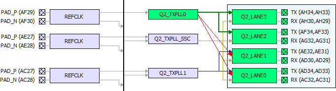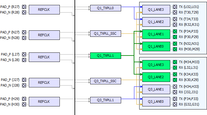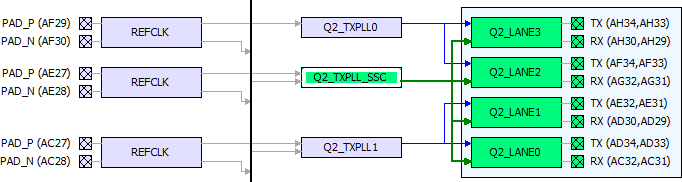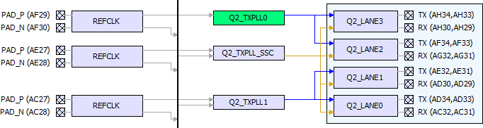 A TXPLL (non-SSC) can connect to two lanes beside it normally (shown in