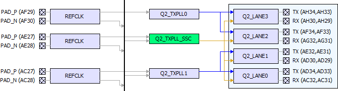 A TXPLL_SSC can connect to all the lanes of a quad (shown in brown lines in the Placement View).