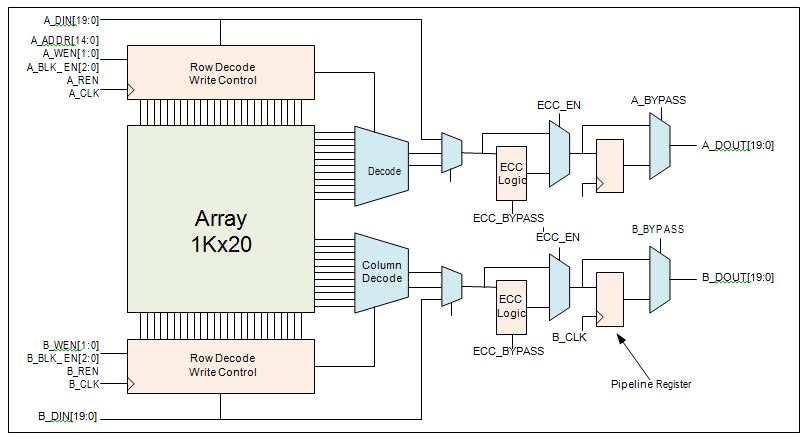 The following figure shows a simplified block diagram of the RAM1K20 memory block. The simplified block illustrates the two independent data ports, ECC, the read-data pipeline registers, read-before-write selection, and the feed-through multiplexors.