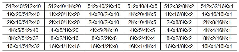 following depth/width: 512x40, 1Kx20, 2Kx10, 4Kx5, 8Kx2 or 16Kx1. There are 36 unique