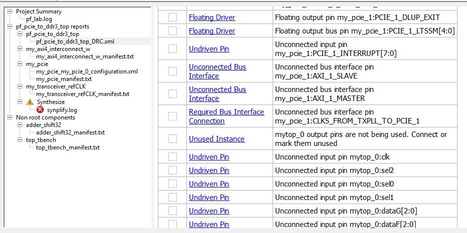 | Undriven Pin | You must connect the pin to a driver or tie it to "1" (tie high), "0" (tie low) or, a constant (tie to constant for bus\slice pins). |