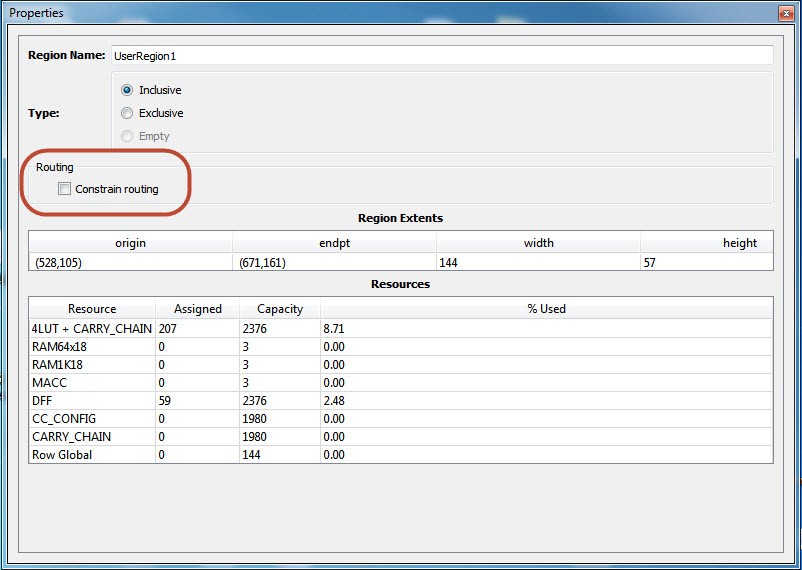 (Ask a Question)By default, when a region is first created, the region properties (Inclusive/Exclusive/Empty) apply to design resources (Placement) only. The Place and Route tool is free to use the routing resources inside the region. To further constrain the Place and Route tool on routing resources usage inside the region, click the Constrain Routing check box in the Properties window.