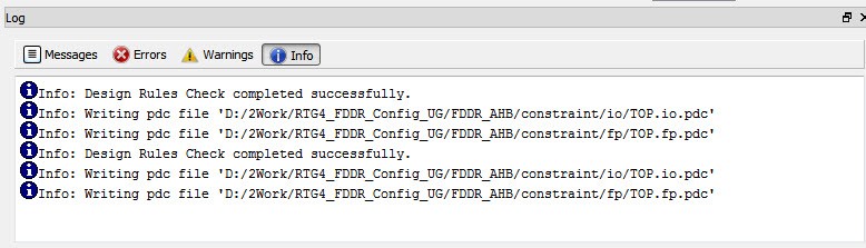 The Log window prints the message that PDC files are updated/written to reflect the changes you have made in Chip Planner.