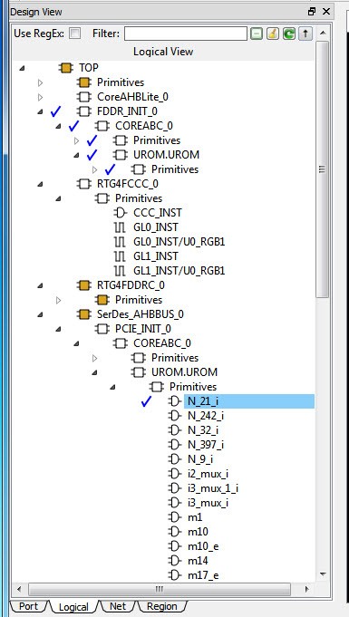 Alternatively, you can drag-drop the component or macro from the port, Logical View, or net onto a user region in the Floorplanner View.The component or macro assigned to the region is identified by a blue check mark: