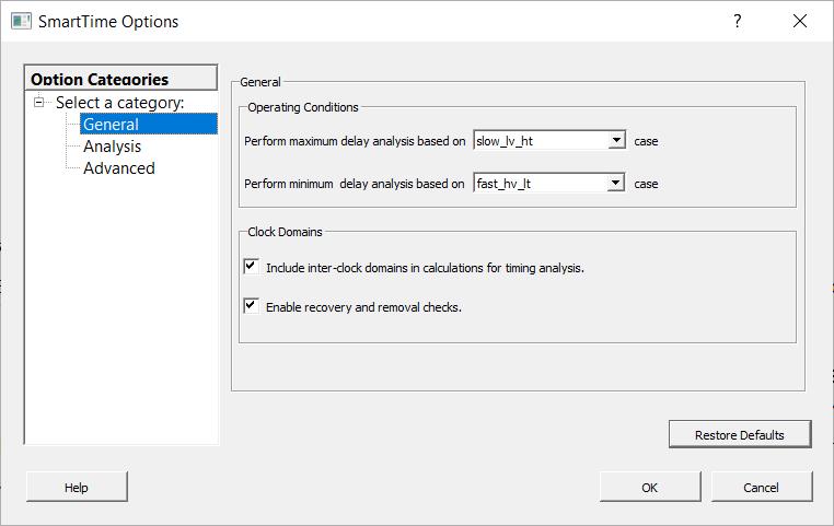 - In the General category, select the settings for the operating conditions. SmartTime performs maximum or minimum delay analysis based on the best, typical, or worst case.
