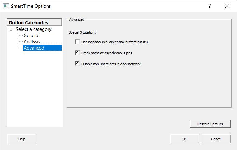 - Specify whether to use loopback in bidirectional buffers (bibufs) and/or break paths at asynchronous pins. Then specify whether to disable non-unate arcs in the clockpath.
