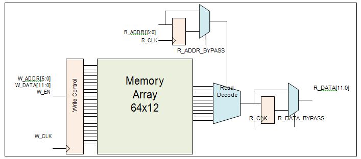 | BLK_EN | Input | Dynamic | Read port block select. When High, read operation is performed. When Low, read-data will be forced to zero. BLK_EN signal is registered through R_CLK when R_ADDR_BYPASS is Low. | High |