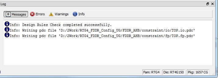 (Ask a Question)The Log window displays all messages generated by Chip Planner. You can filter the messages according to the type of message: Error, Warning, and Info. If you made and saved changes in Chip Planner, the Log window shows the name and location of the PDC file(s) that were edited to reflect the changes.