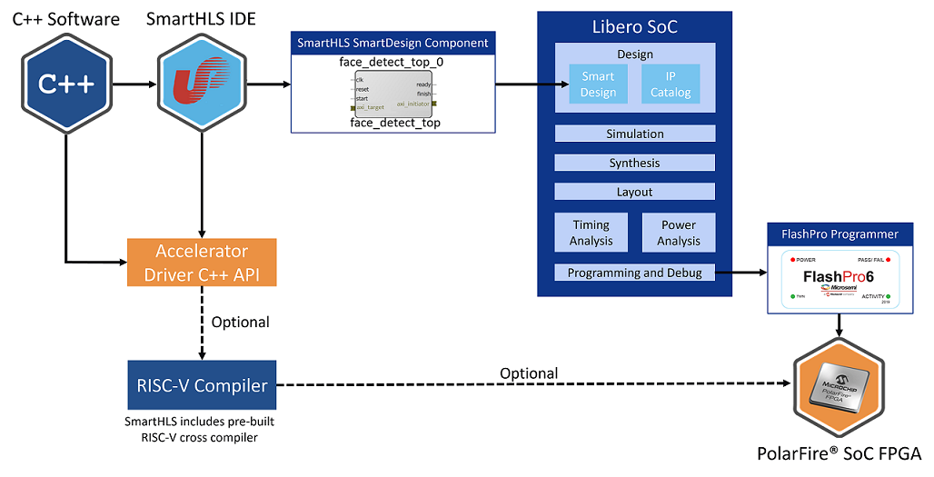 (Ask a Question)Smart high-level synthesis (SmartHLS™) Compiler is an Eclipse-based integrated development environment that takes C++ software code as input and generates a SmartDesign IP component (Verilog HDL) as an output. Hardware engineers can instantiate the generated SmartDesign IP component in the SmartDesign Canvas available in Libero® SoC design suite to build an FPGA system.