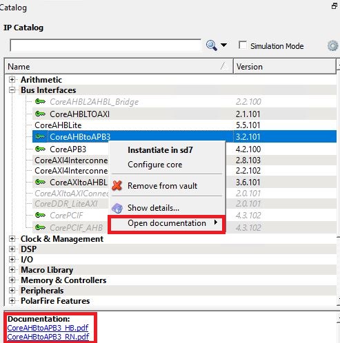 Catalog tab and select an IP core. The documentation