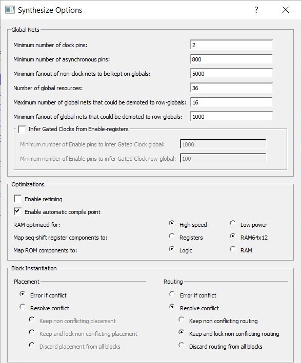 (Ask a Question)If there are multiple blocks instantiated in the top-level design, users can use the synthesis options to resolve the conflicts. These options appear only if there are blocks in the design. Use the synthesis options () to resolve place and route conflicts.