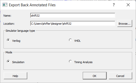 | Mode | Set the mode to Simulation or Timing Analysis. |